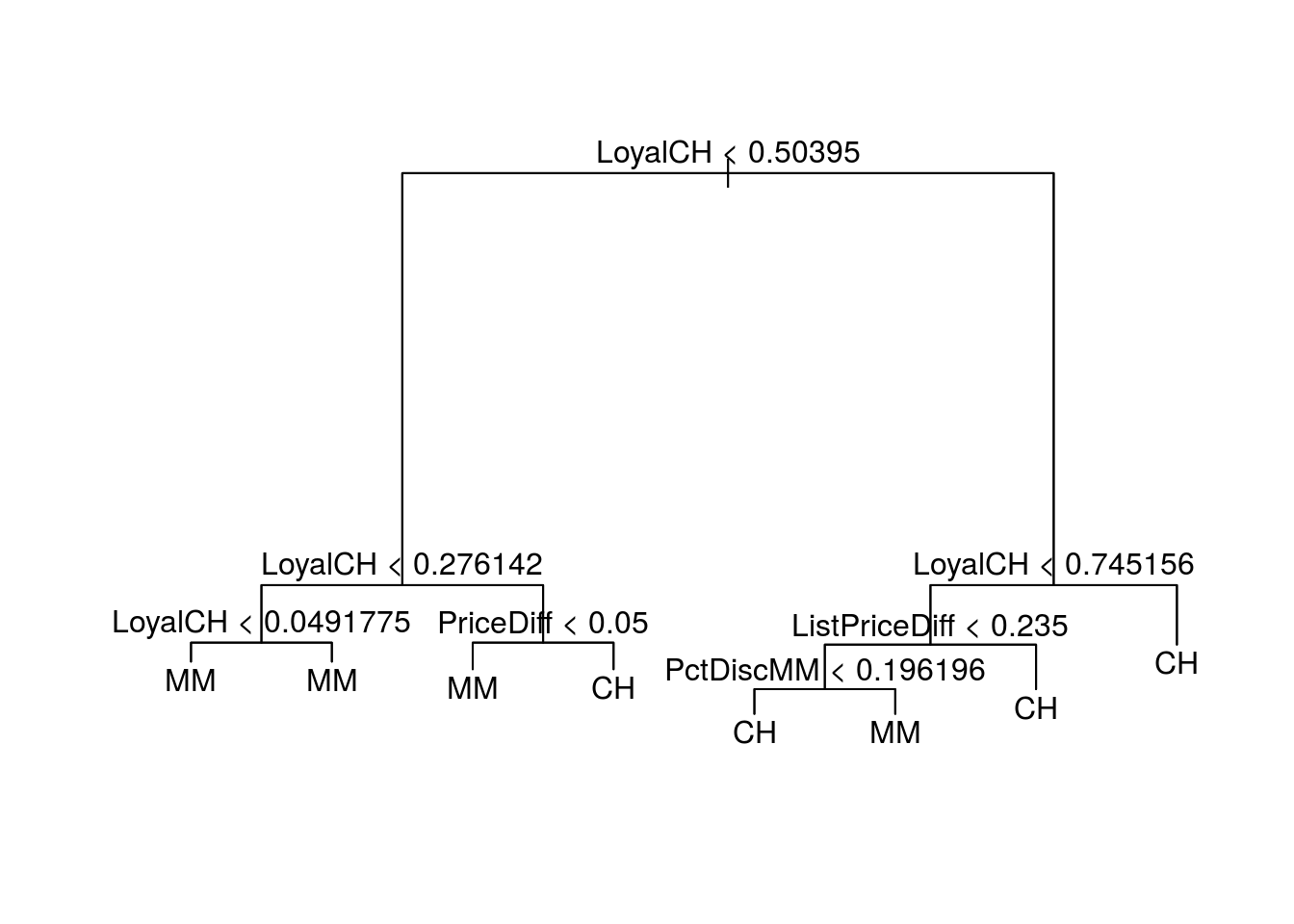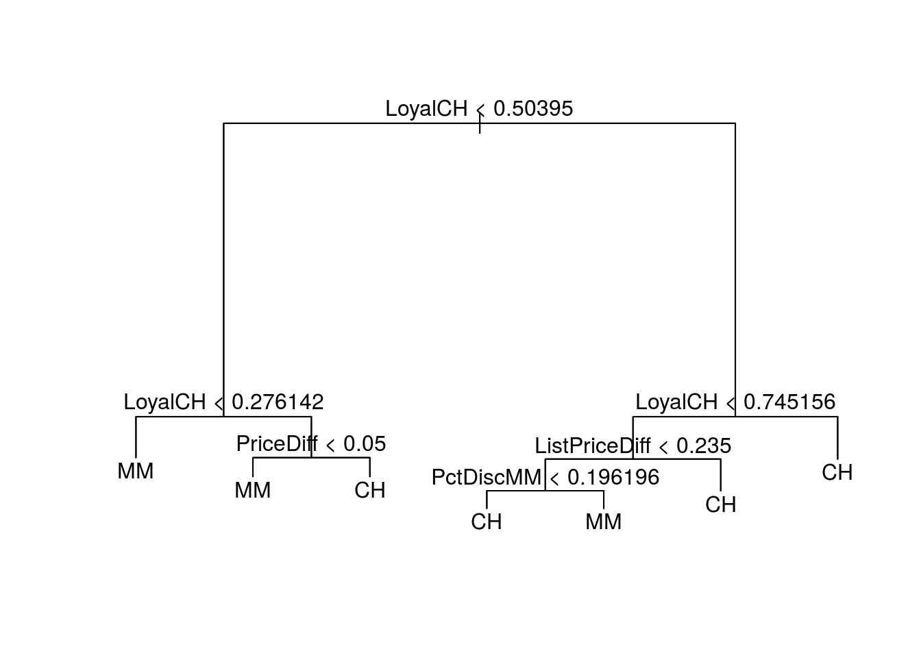 Classification tree: tree(formula = Purchase ~ ., data = OJ.train) Variables actually used in tree construction: [1] “LoyalCH” “PriceDiff” “ListPriceDiff” “PctDiscMM”