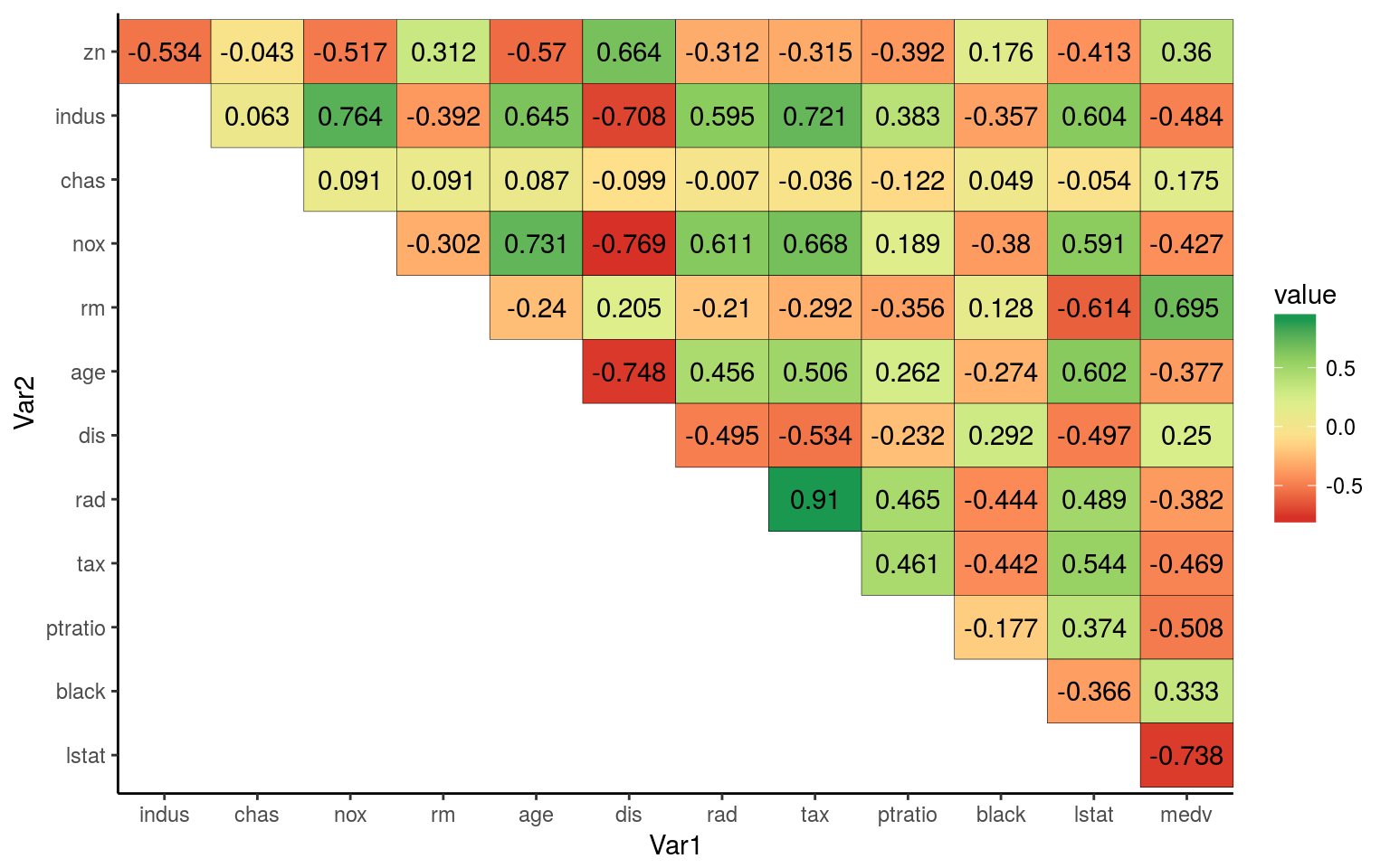 The colors represent how far apart two predictors are from eachother. For example when lstat is high medv is low. And when rad is high tax is also high. The more red something is the more they differ, and the more green something is the more they are simmilar. Yellow indicates that there is almost no correlation between the two variables.